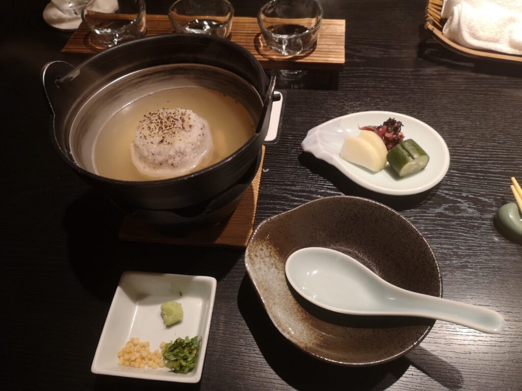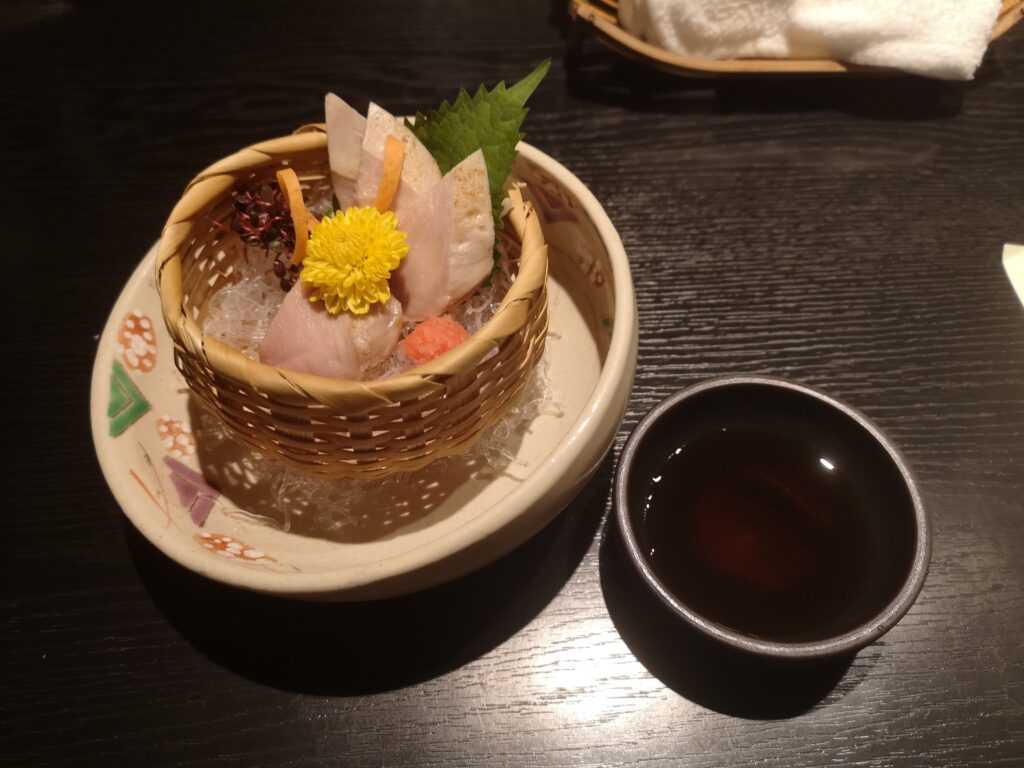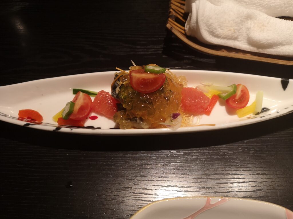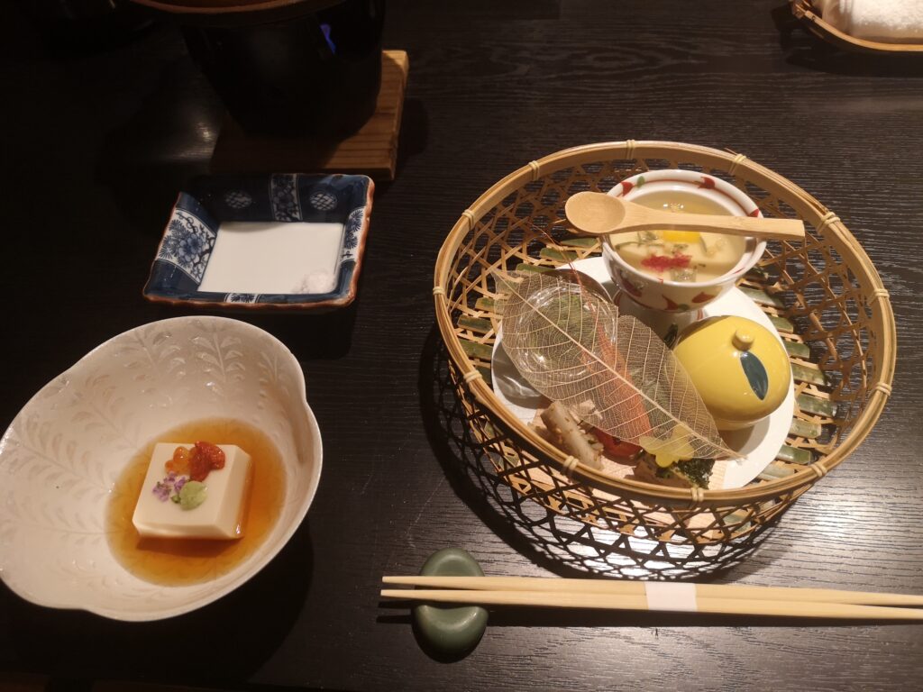 Die Appetithäppchen waren kalte Vorspeisen. Das links war ein weicher Klotz in einer leicht fischigen (Dashi-) Brühe. Die kleinen Tupfer oben drauf verliehen dem eher unwürzigen Tofu die nötige Vielfalt. Der Korb rechts bestand ähnlich dazu aus kleinen leicht fischigen oder würzigen Gemüseteilchen und einem Shrimp. Jeder Streifen ein leicht anderes Aroma, eine leicht andere Konsistenz. Eine leichte Brühe hier, ein wenig Aroma da, konsistenz zart oder knackig. Nichts, wovon ich mich ausschließlich hätte ernähren können, aber einfach verschiedene Geschmäcker raffiniert kombiniert. Wie ich später bemerkte, ein wohlüberlegter Auftakt, der die folgenden Gerichte noch mehr zur Geltung bringen sollte.