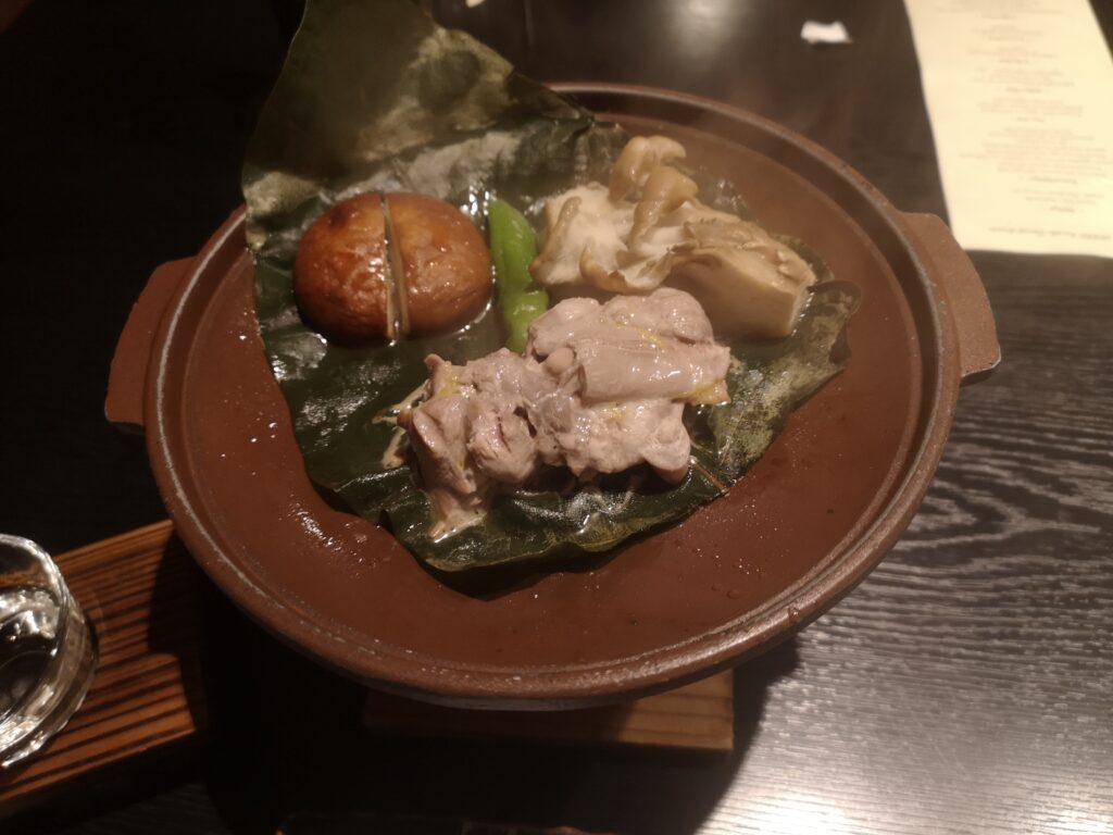 Auf unseren Tischen waren ebenfalls zugedeckte Töpfchen, unter denen etwas stand, das einem Teelicht ähnelte. Ich bezeichne das Konstrukt im Folgenden liebevoll als „Campingkocher“. Man zeigte uns die rohen Speisen im Topf und entzündete die Feuerquelle, die dann doch deutlich stärker brannte als ein Teelicht. Nach etwa 10 Minuten würde man zurückkehren und dann wäre es gar.