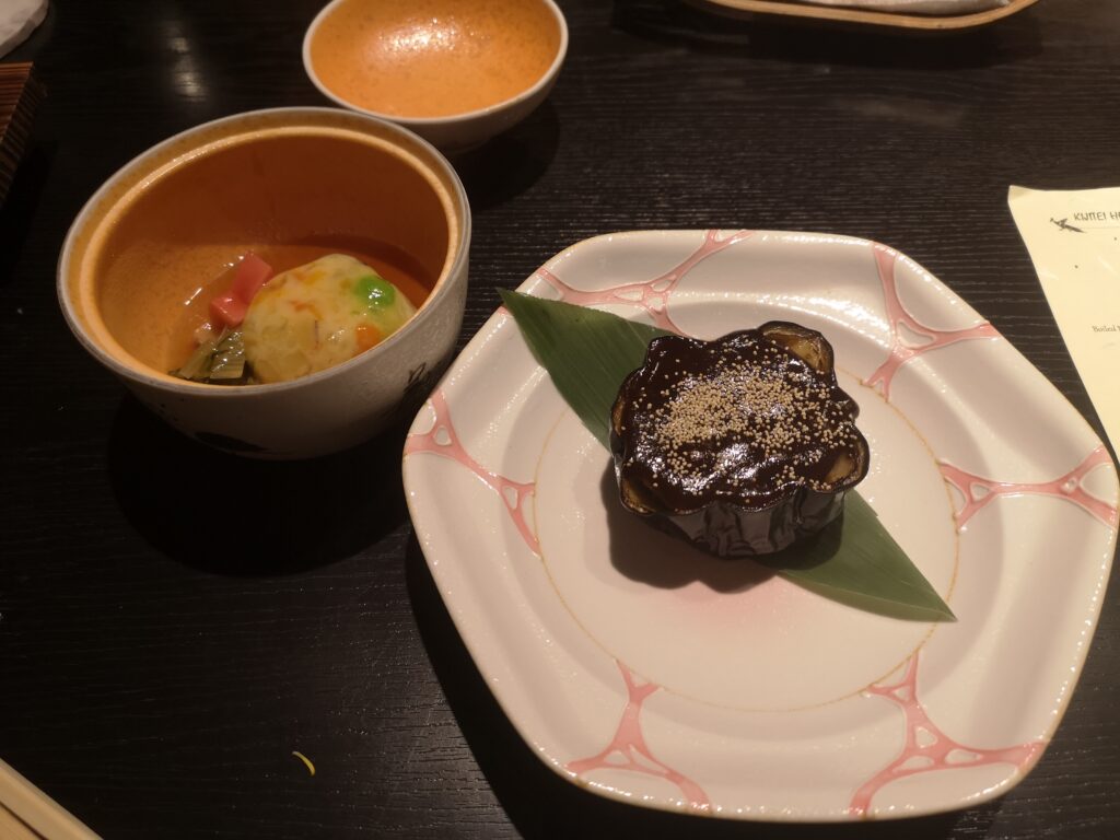 Die Aubergine war ein Meisterwerk. Für mich sonst das „geschmackloseste & unnötigste“ Gemüse, das man irgendwo reinmischt, weil noch welches im Kühlschrank war, war hier in Perfektion zubereitet. Die Aubergine war wunderbar weich und völlig durchzogen von der süßen Miso Paste. Die Außenhaut war leicht knusprig und es war einfach ein Hochgenuss. Die Süße nach all den kalten / fischigen / däftigen Aromen war genial. Der Kloß aus Köstlichkeiten in der Brühe daneben war auch lecker, aber er verblasste in meiner Erinnerung einfach völlig gegen diese Aubergine.