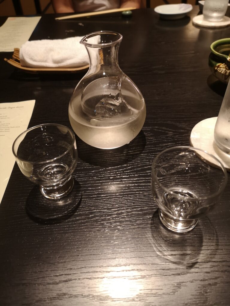 Dazu bestellten Hendrik und ich einen Sake Flight (3 Sake zum testen) und ich pickte mir natürlich zielsicher den teuersten als meinen persönlichen Favoriten heraus. „Daiginjo“ ist ein besonders aufwändig hergestellter Typ von Sake, der sich für mich durch seinen samtig weichem Geschmack auszeichnet. Davon bestellten wir noch eine Portion, die in diesem Wundergefäß (siehe Bild) serviert wurde. Der Sinn: Ein Eiswürfel liegt in der Mulde des Gefäßes und kühlt den Sake, aber ohne, dass das Eis das Getränk verwässern könnte. Für das Auskippen ist die Mulde so konstruiert, dass das Eiswasser keine Chance hat herauszurinnen. Später in Tokyo überlegten wir so ein Glas zu erwerben, aber die 7000 Yen (ca. 46€) schreckten uns dann doch ein wenig ab. Zumal ich in Kyoto bereits eine ganze Flasche Daiginjo Sake für 6600 Yen erworben hatte.