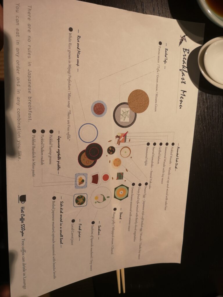 Zum Schluss möchte ich noch einmal auf eine Bemerkung auf der Frühstückskarte hinweisen, die unserer Verwirrung bezüglich der morgendlichen Essgewohnheiten der Japaner endlich ein wenig Klärung verschaffen sollte:
