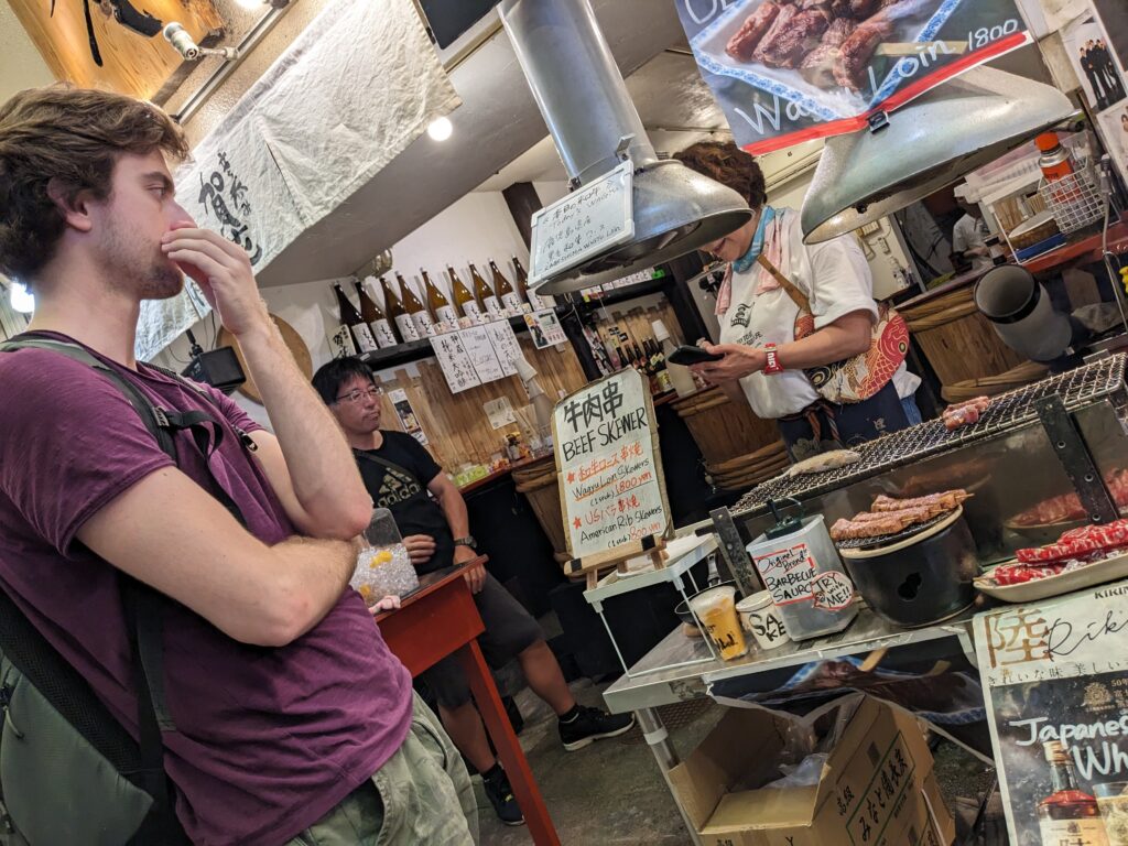 Am Ende gingen wir durch eine belebtere Gasse zurück ins Tal, wo es neben Souvenirständen auch Snacks gab. Die örtliche Spezialität haben wir auch getestet: Gurke am Spieß.