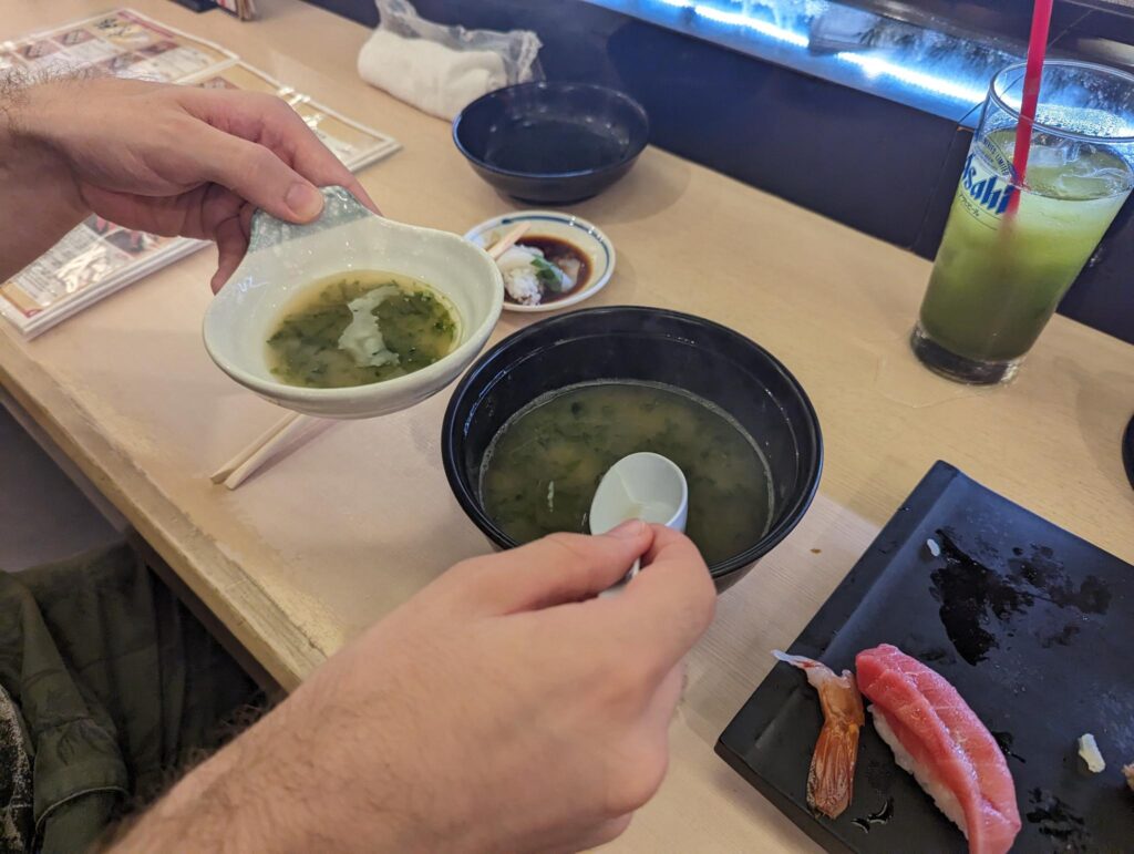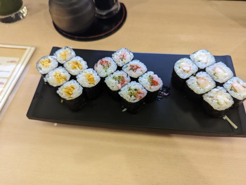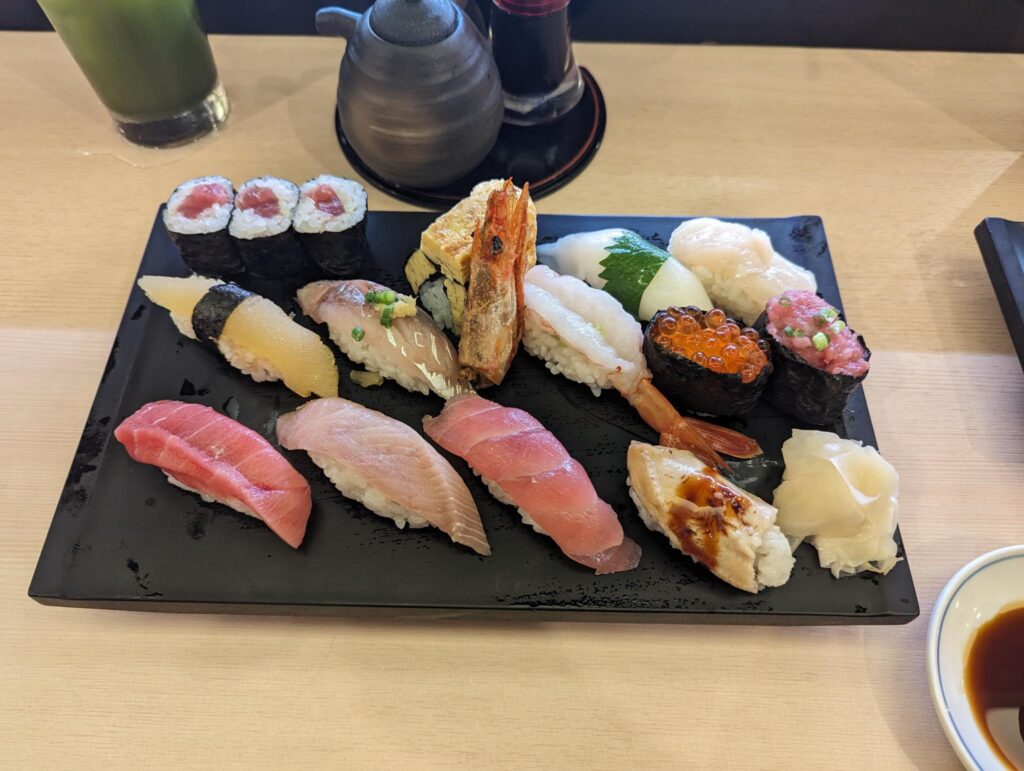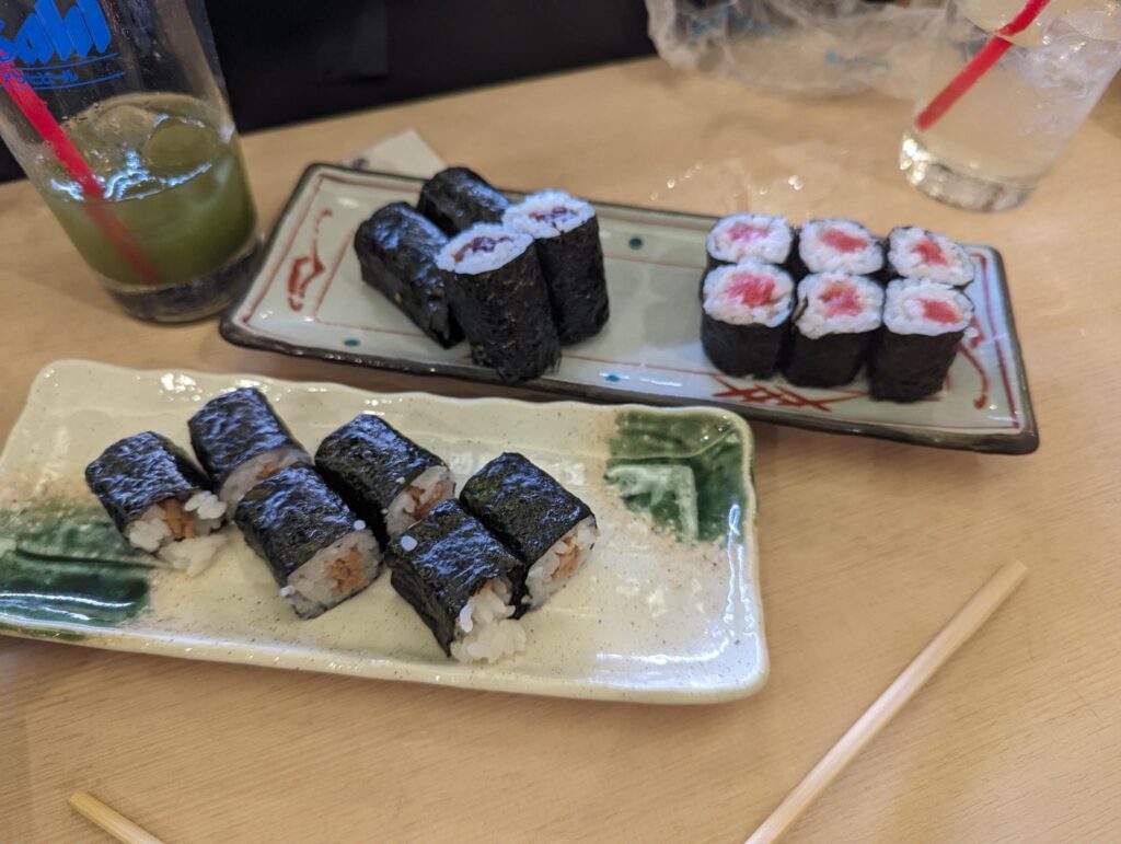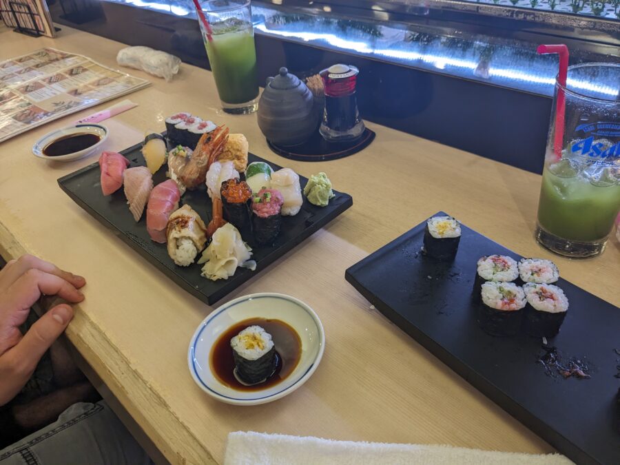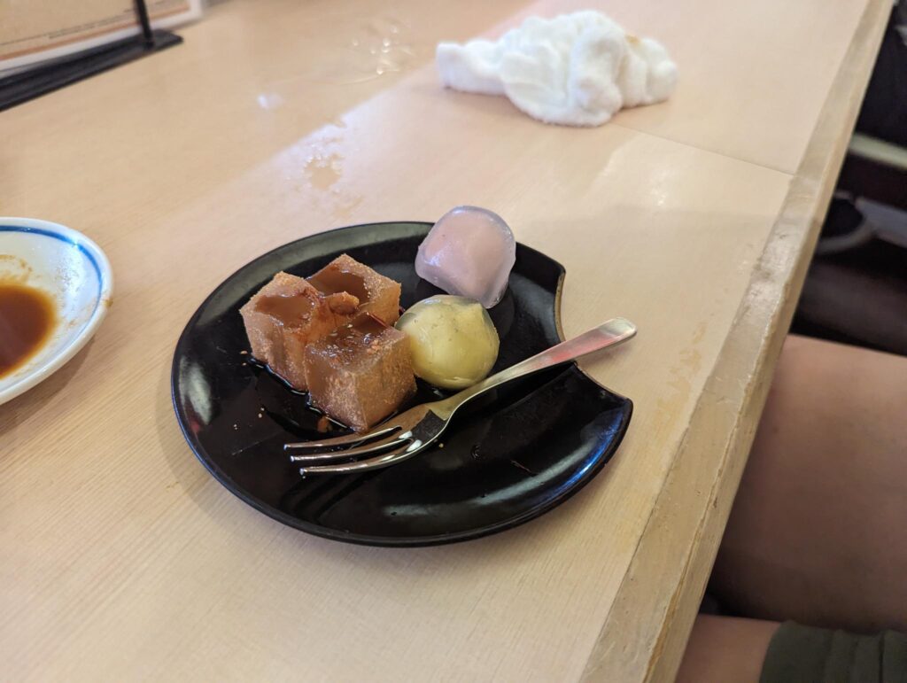 In der Stadt hatte ich schon länger einen Foodtrend im Blick, den wir auf jeden Fall ausprobieren wollten. Es gibt einen Laden, der Mochi verkauft und wo die Reismasse mit Händen und Hämmern per Hand geknetet wird. Die tägliche Knet-Show war zwar schon vorbei, doch in den Genuss eines solchen mit roter Bohnenmasse gefüllten Mochi kamen wir trotzdem. Es war wirklich sehr lecker 😀